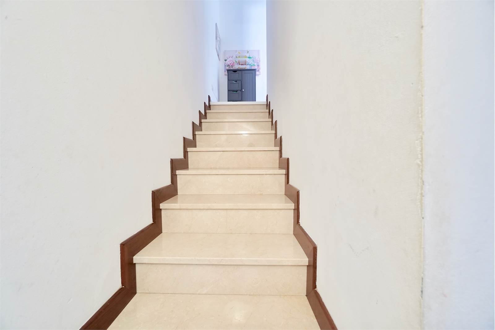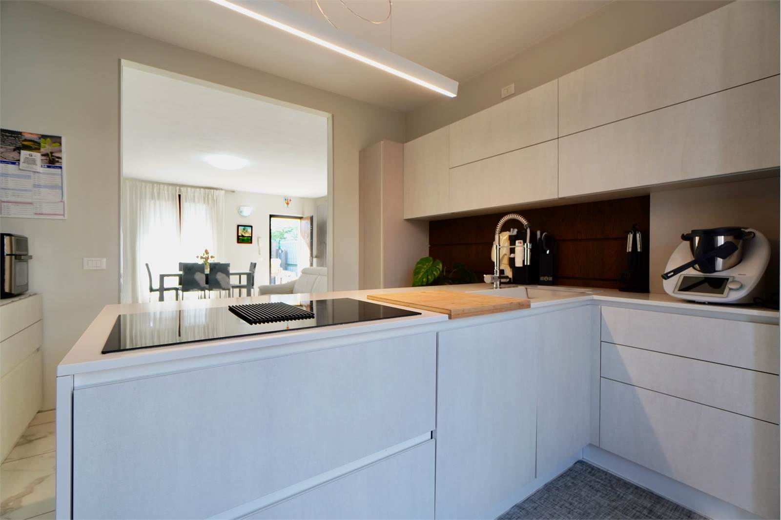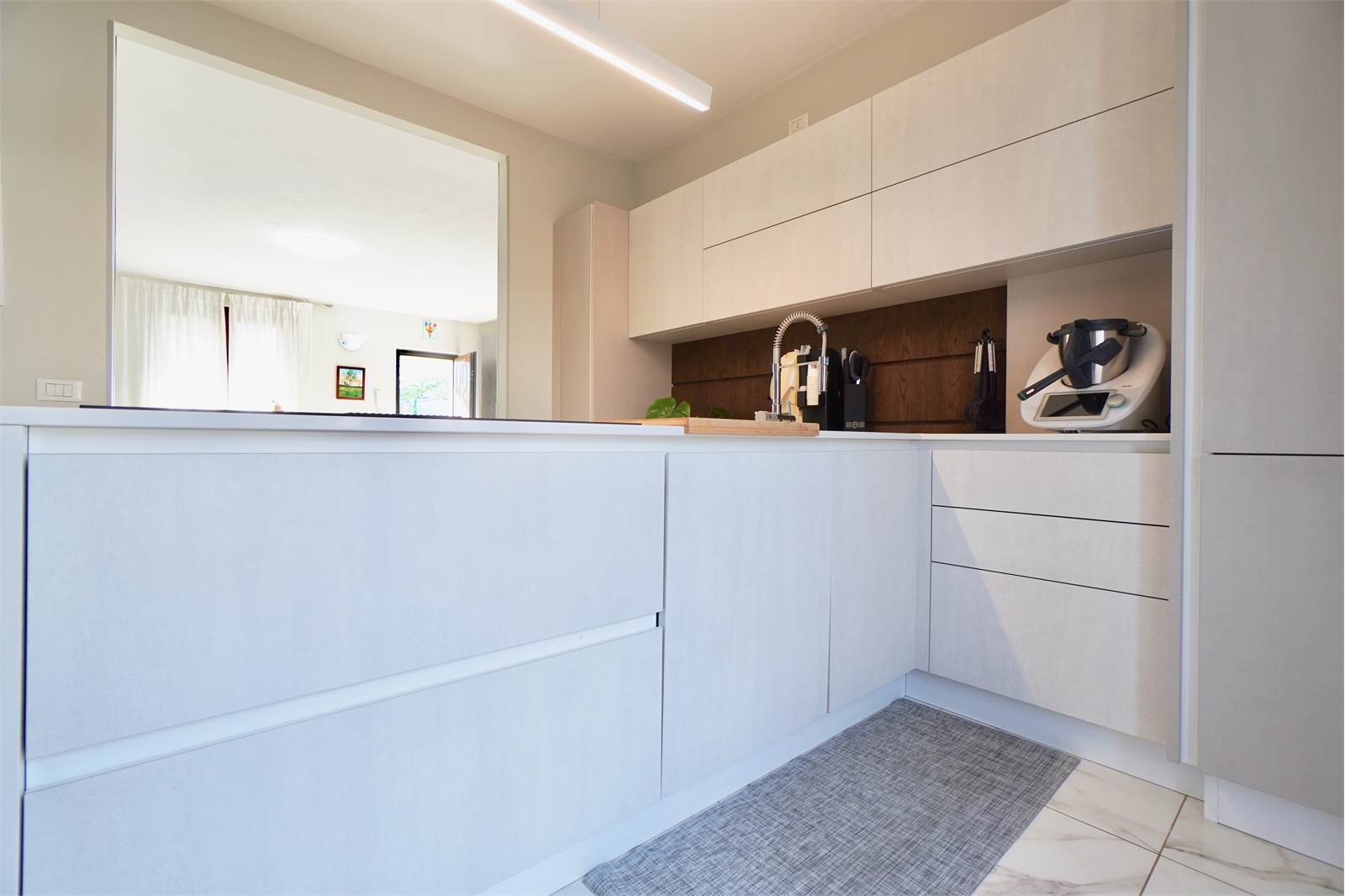 La soluzione si sviluppa su tre livelli, al piano terra troviamo un ampio e luminoso soggiorno, cucina a vista con accesso diretto al balcone sul retro della villa, disimpegno e bagno.