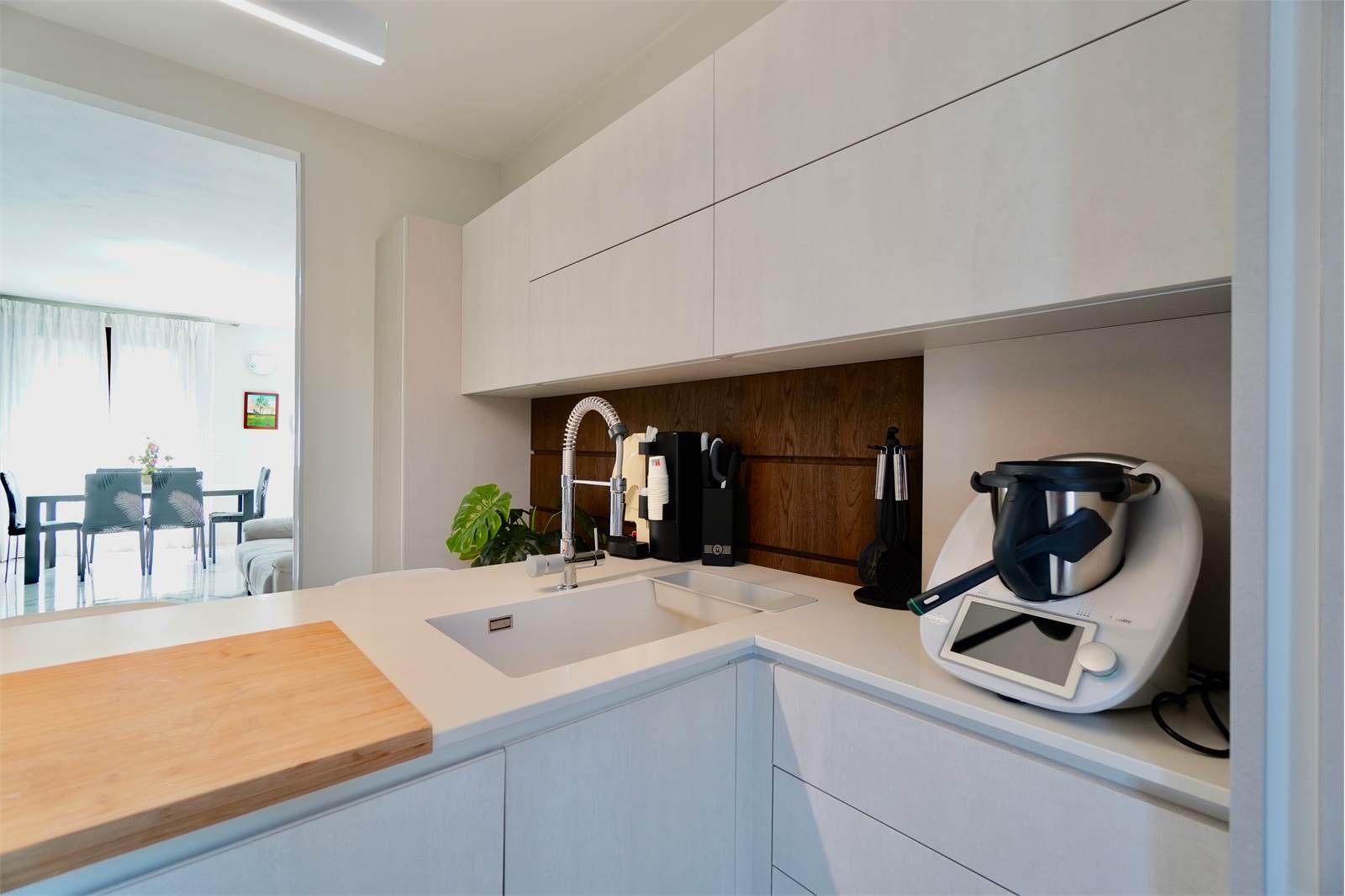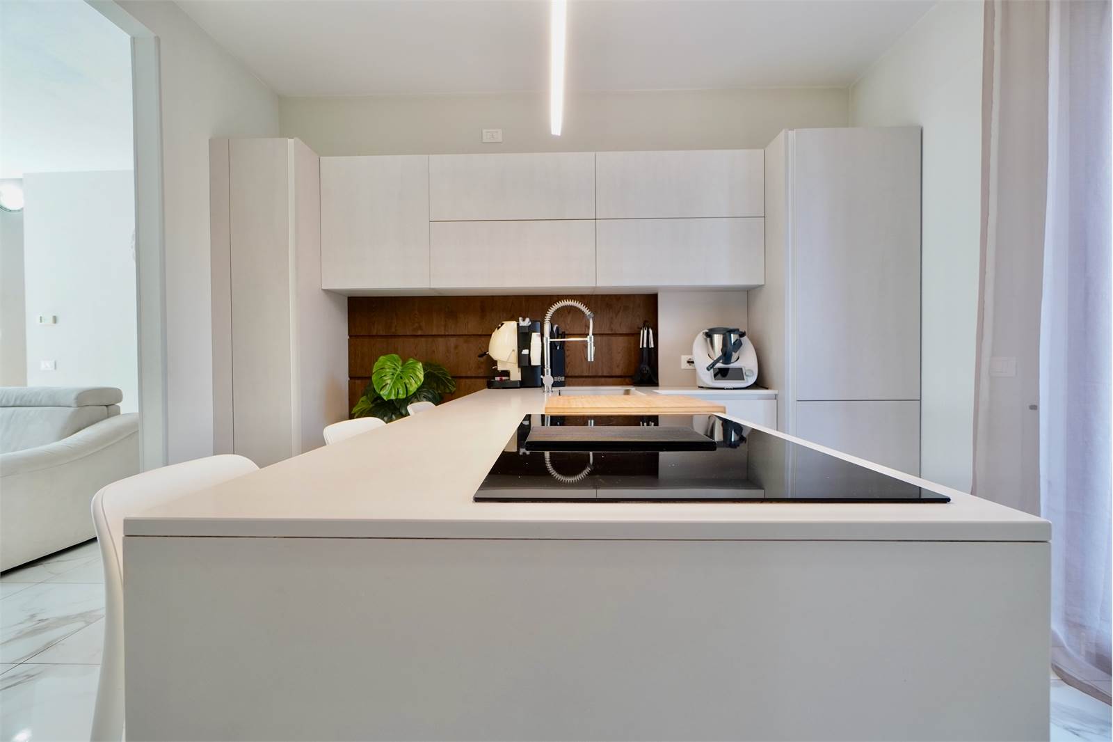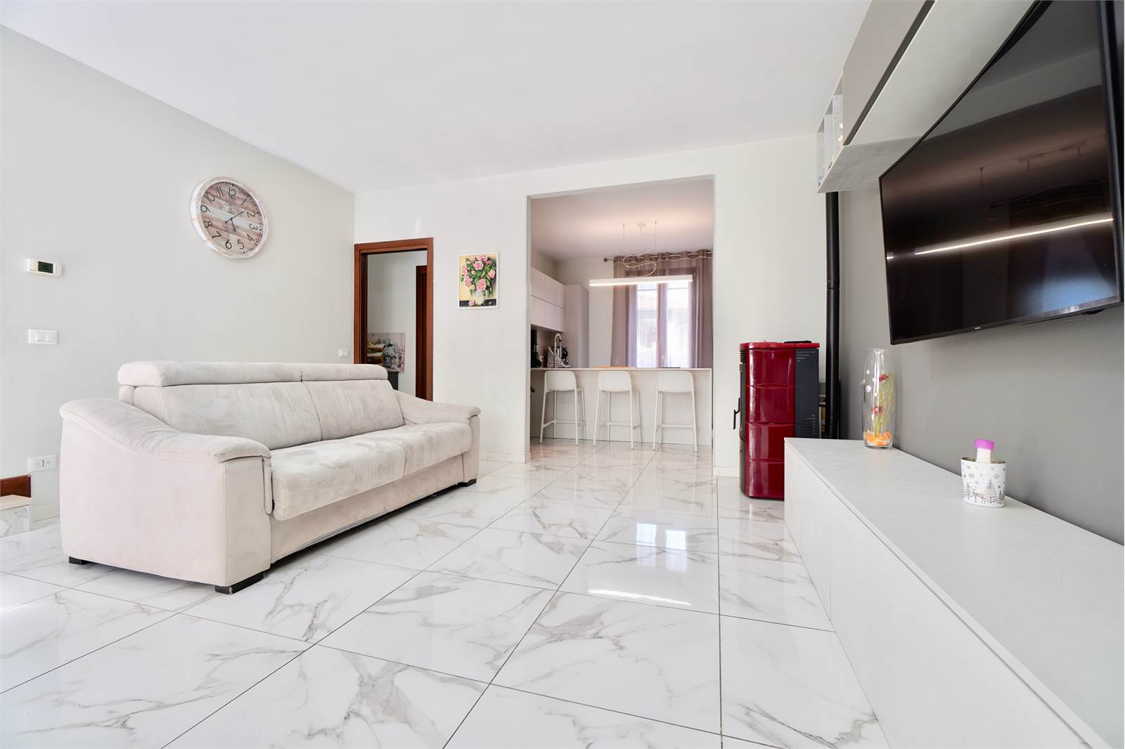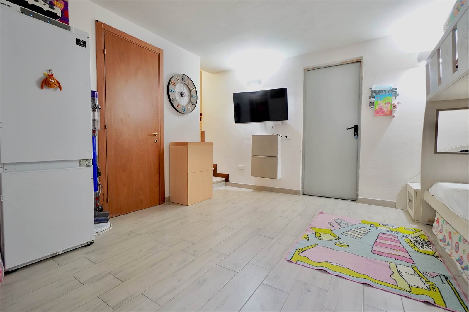 La soluzione si sviluppa su tre livelli, al piano terra troviamo un ampio e luminoso soggiorno, cucina a vista con accesso diretto al balcone sul retro della villa, disimpegno e bagno.