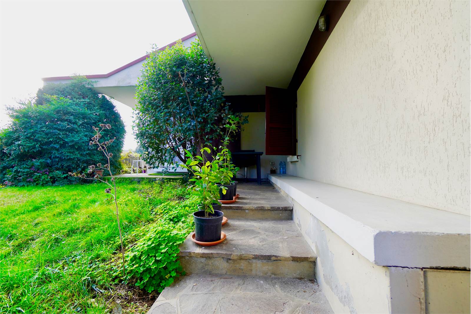 La villa è circondata su tre lati dal giardino esclusivo di circa 280 mq. Al piano interrato completano la soluzione il garage, la taverna con camino e la lavanderia.