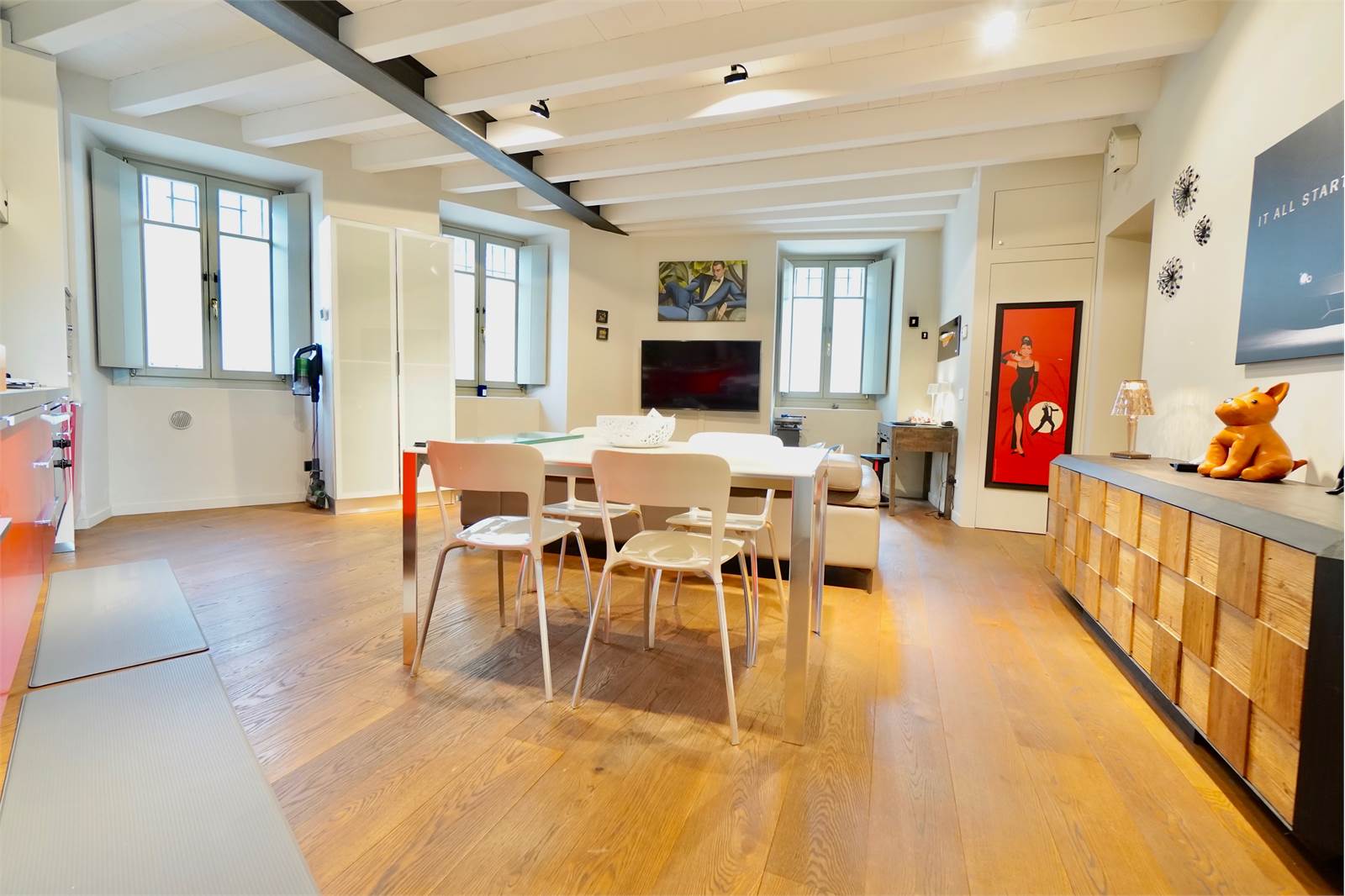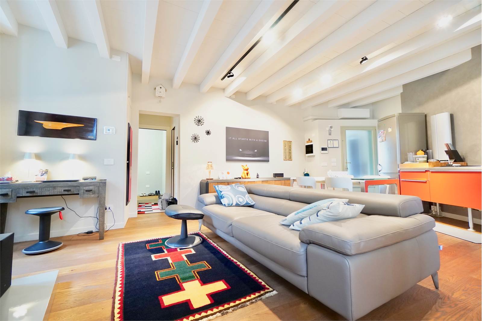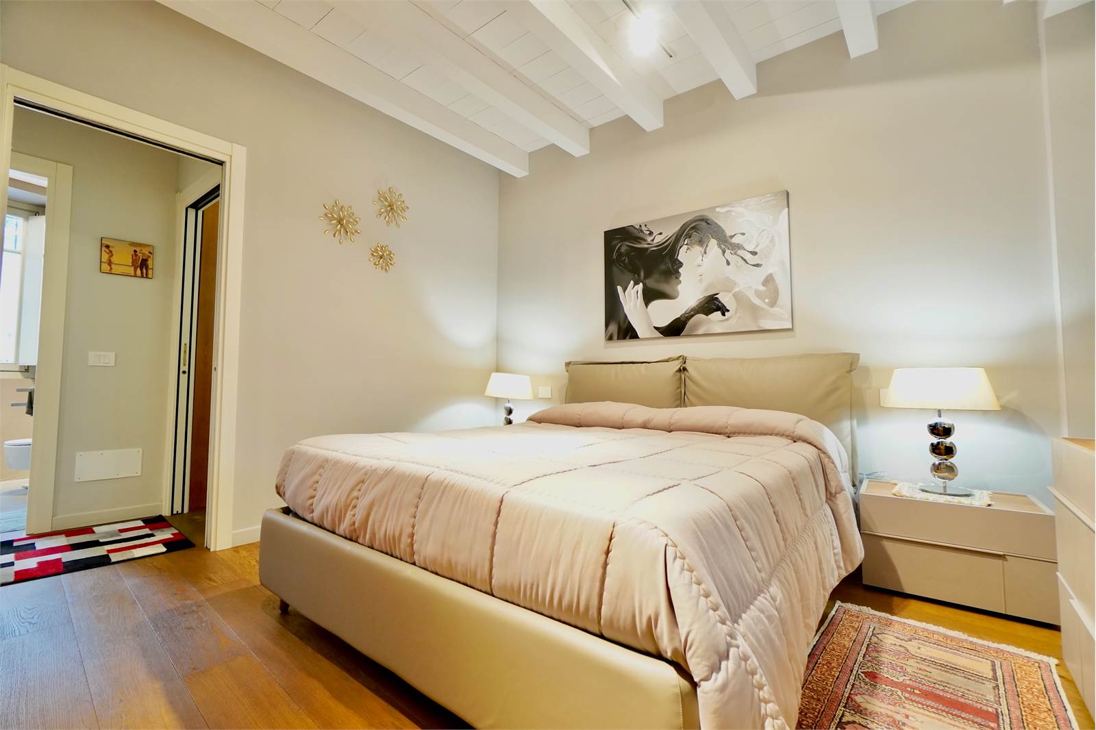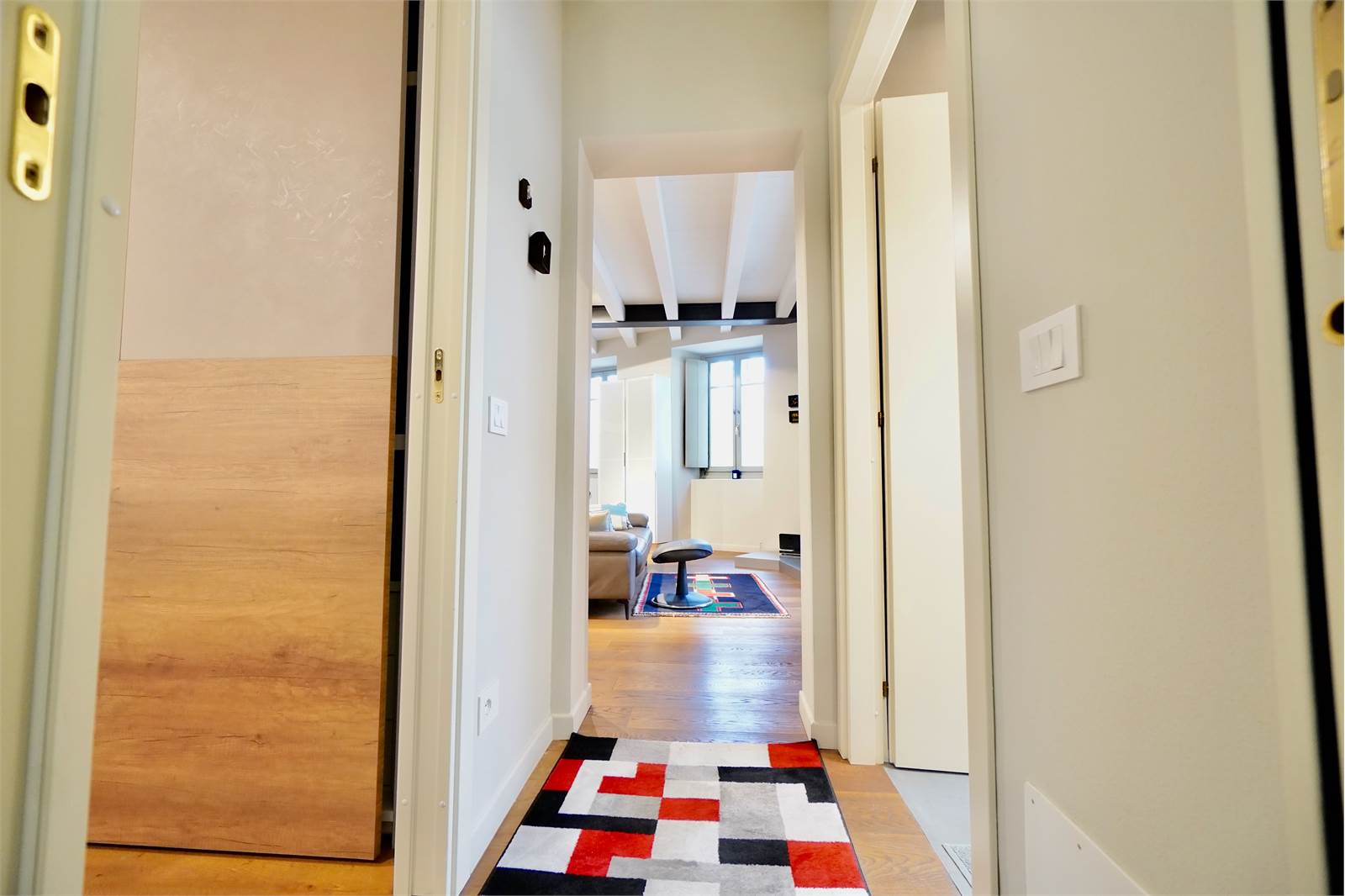L’intera abitazione è valorizzata da elegante parquet in tutti gli ambienti e da splendide travi a vista sbiancate che donano luminosità e un tocco moderno, creando un perfetto equilibrio tra il fascino storico della corte e il design attuale degli interni.