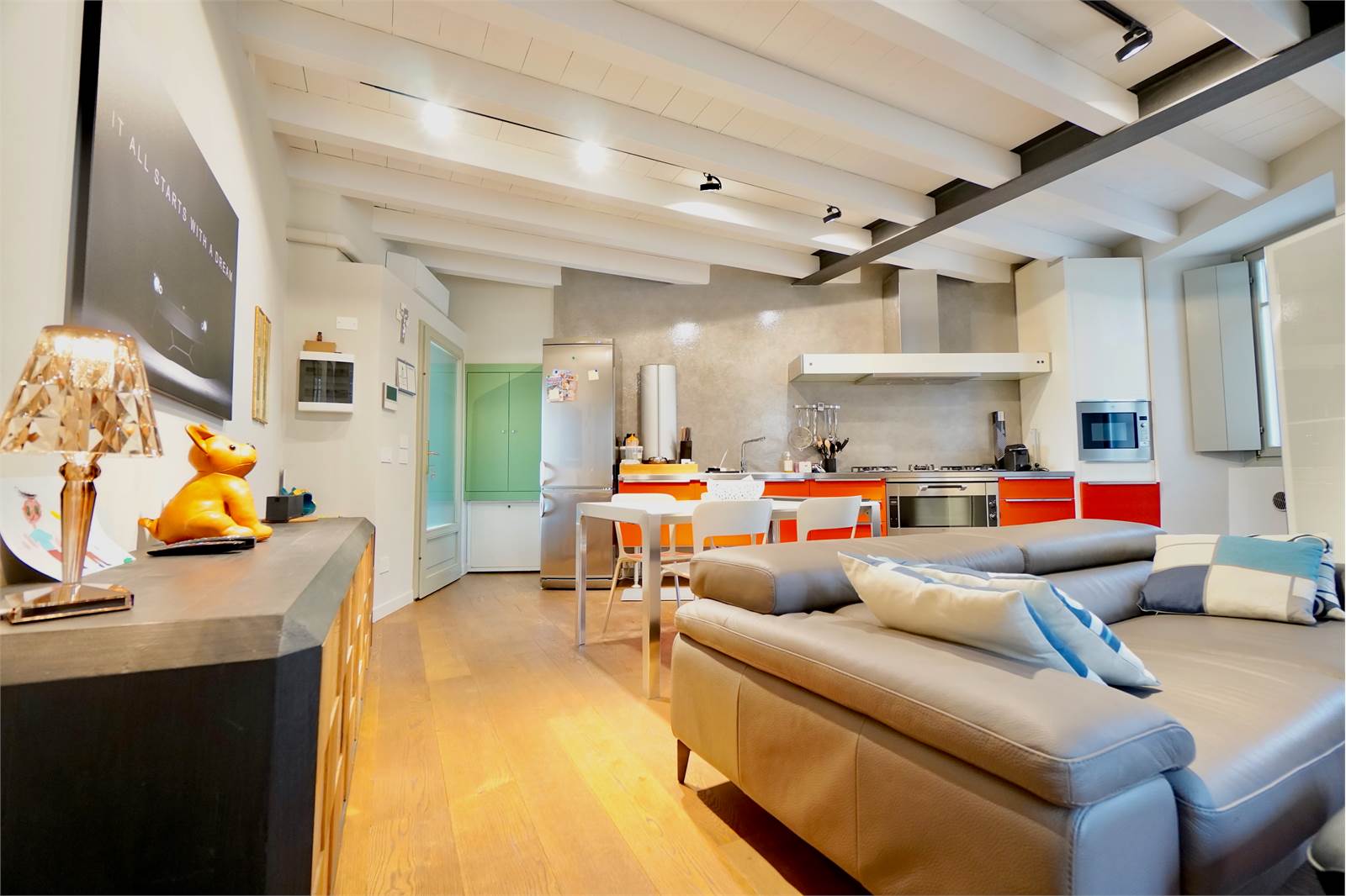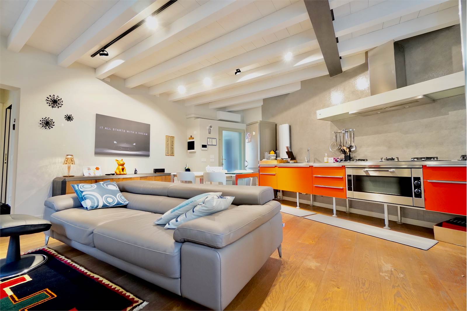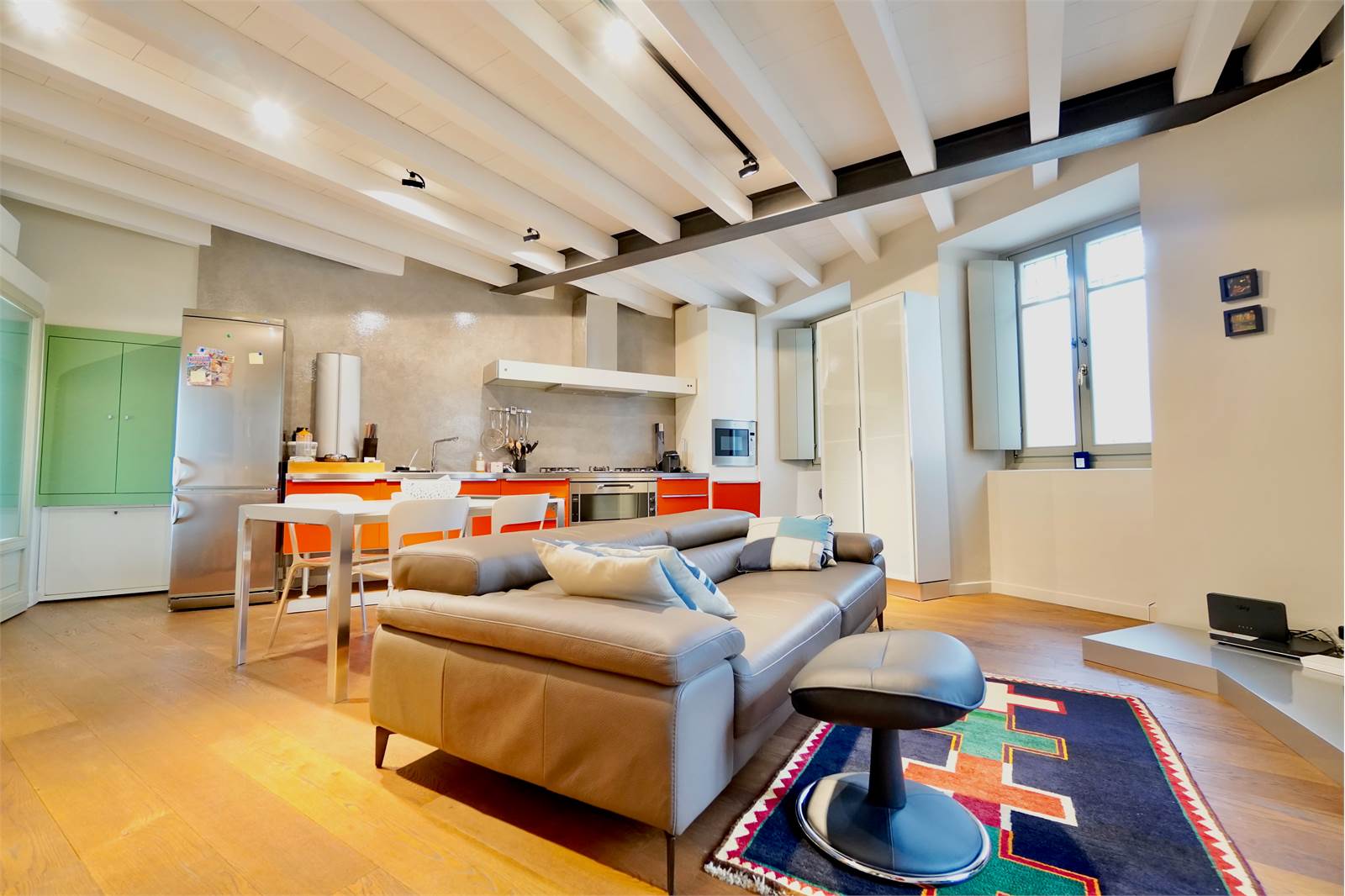 L’intera abitazione è valorizzata da elegante parquet in tutti gli ambienti e da splendide travi a vista sbiancate che donano luminosità e un tocco moderno, creando un perfetto equilibrio tra il fascino storico della corte e il design attuale degli interni.