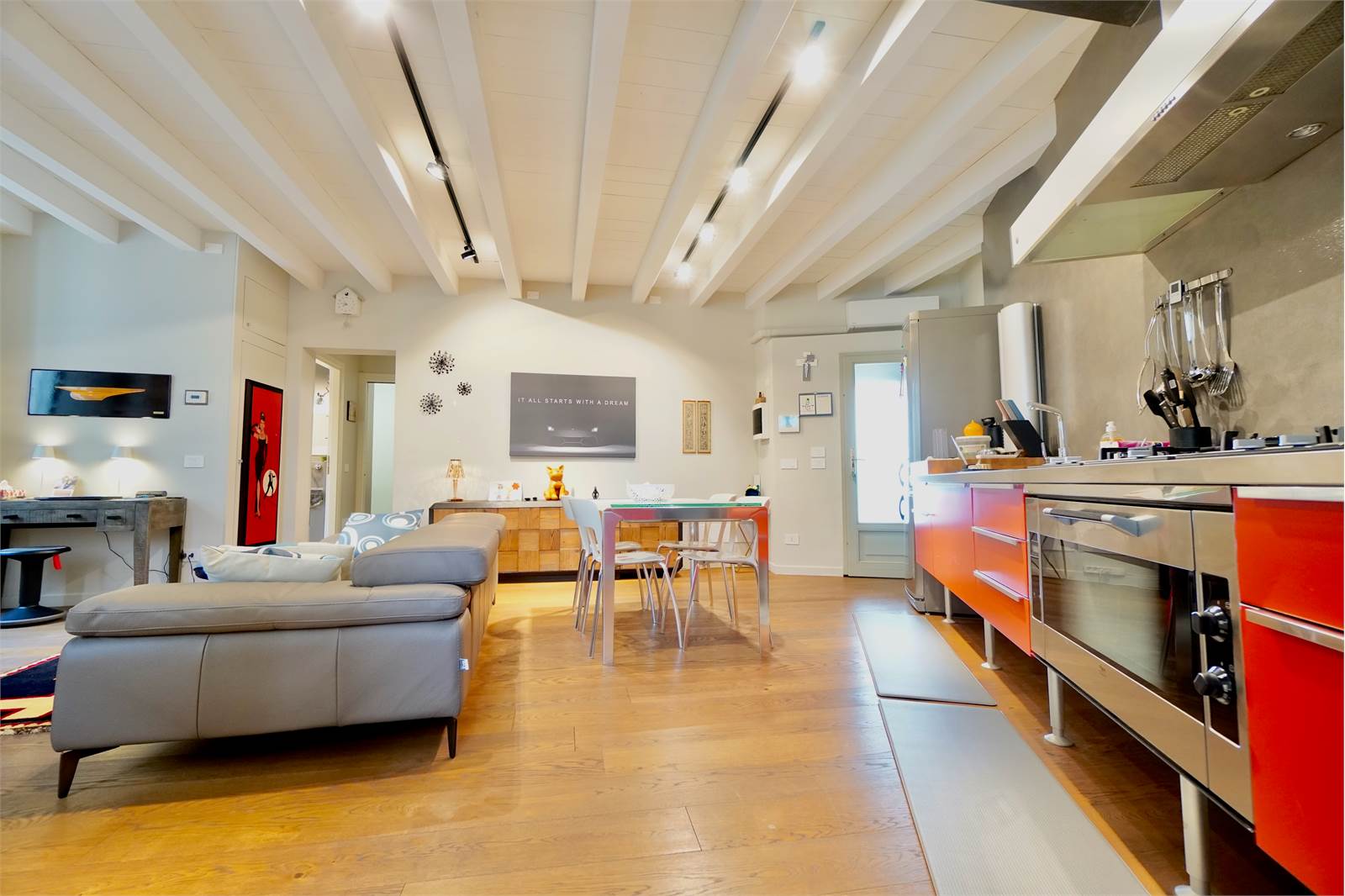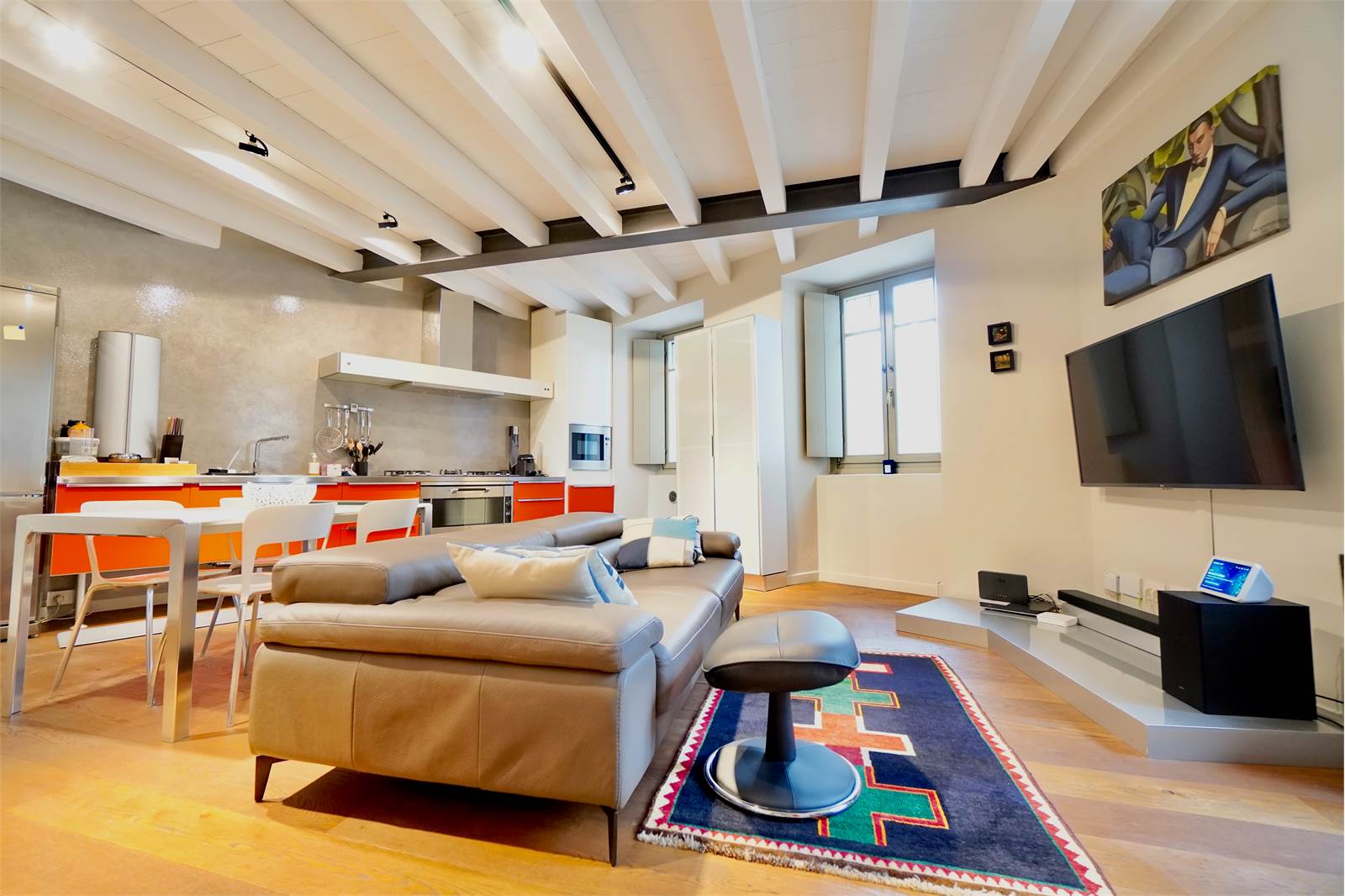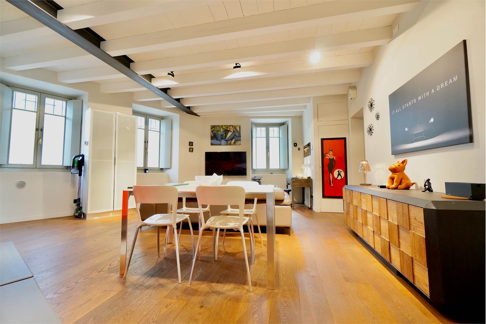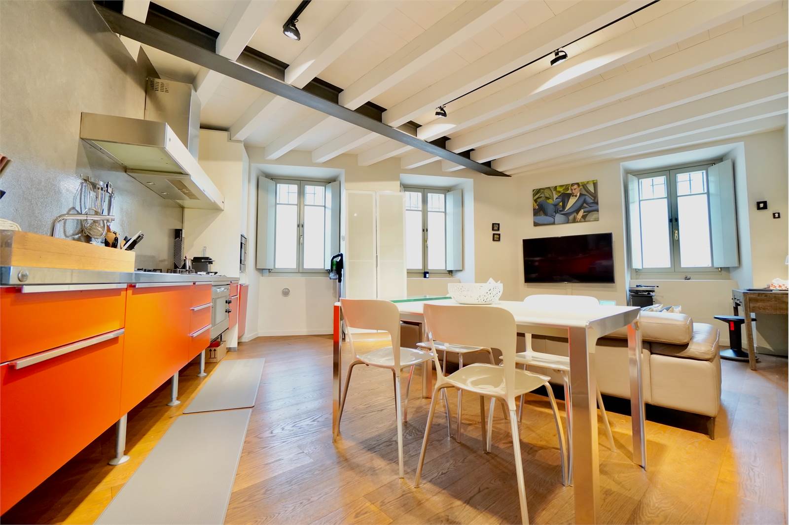 L’intera abitazione è valorizzata da elegante parquet in tutti gli ambienti e da splendide travi a vista sbiancate che donano luminosità e un tocco moderno, creando un perfetto equilibrio tra il fascino storico della corte e il design attuale degli interni.